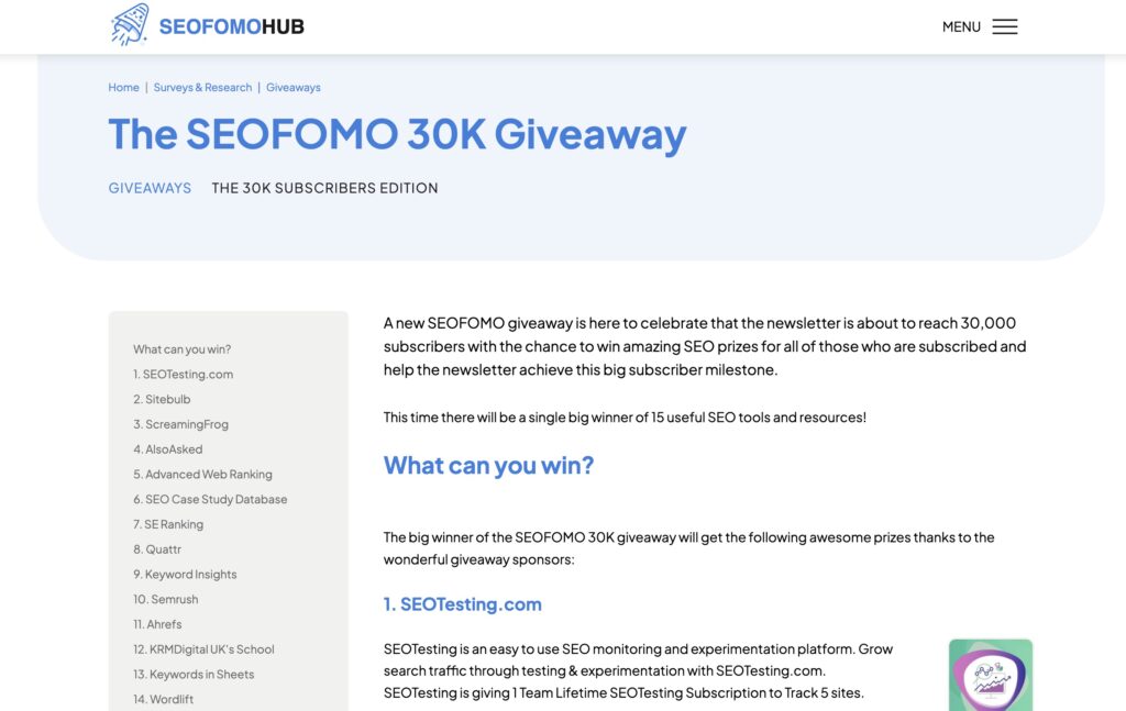 So she ran a giveaway. Entry required you to be a SEOFOMO subscriber first, then referring other SEOs to the list to earn entries.