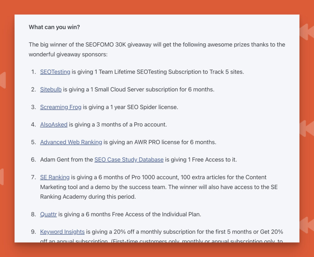 2. She picked prizes her audience wants. She included SEO tools and resources, the exact things her readers are already paying for (and complaining about on Twitter). When SEOs are the audience, SEO software is the obvious prize to give away.