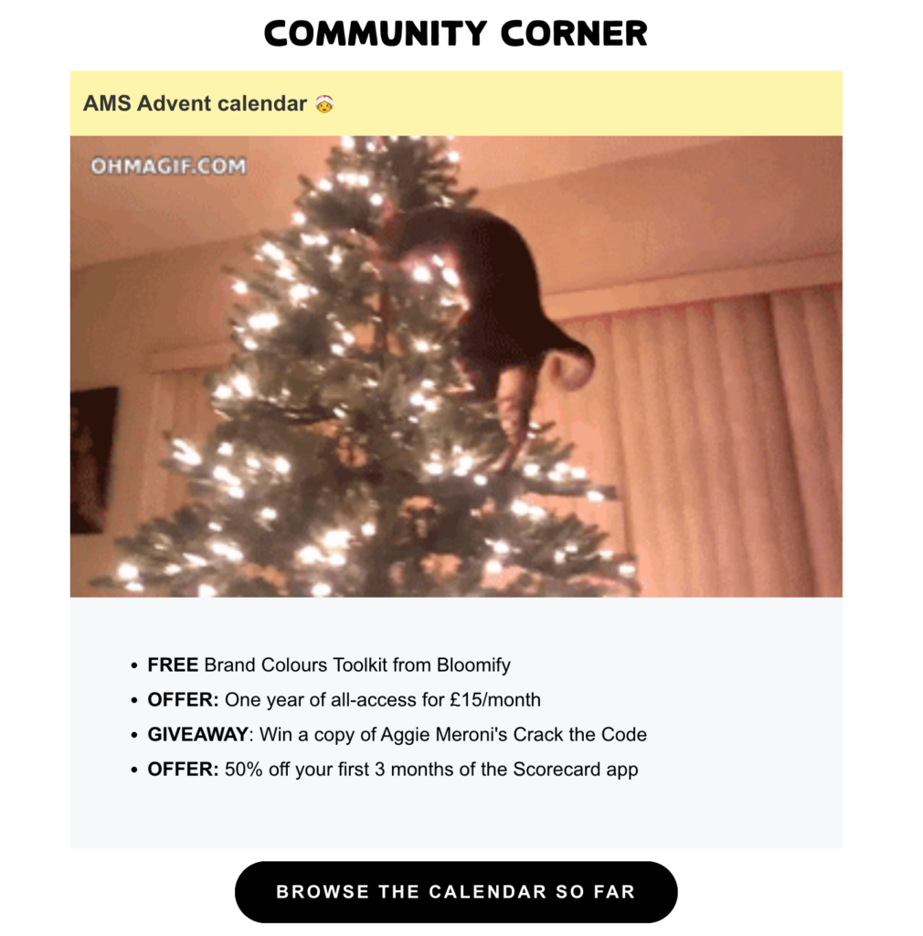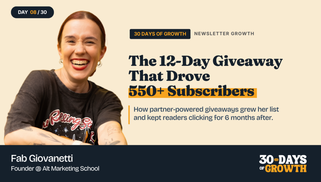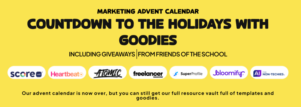That’s what Fab Giovanetti did with Alt Marketing School. She built a partner-powered giveaway series modeled after a 12 Days of Christmas advent calendar, where each day featured a different tool, platform, or community offering something free. 1 partner per day for 12 days.